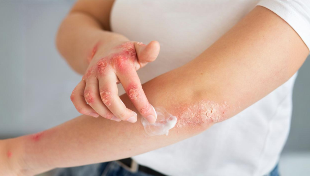 Psoriasis is a chronic condition where an overactive immune response causes multiplication of skin cells. These skin cells show up as patchy or scaly skin, most often on, but not restricted to the scalp, elbows, or knees. Some patients experience stiff, swollen, and painful joints, a condition referred to as Psoriatic Arthritis.